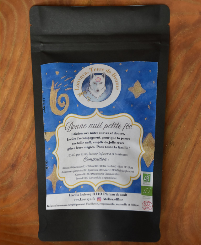 Bonne nuit petite fée, une infusion créé par amour du bon sommeil réparateur. Cette infusion florale est utilisable par tous, du petit enfant, jusqu'aux personnes âgées, en passant par les femmes enceintes et allaitantes.
