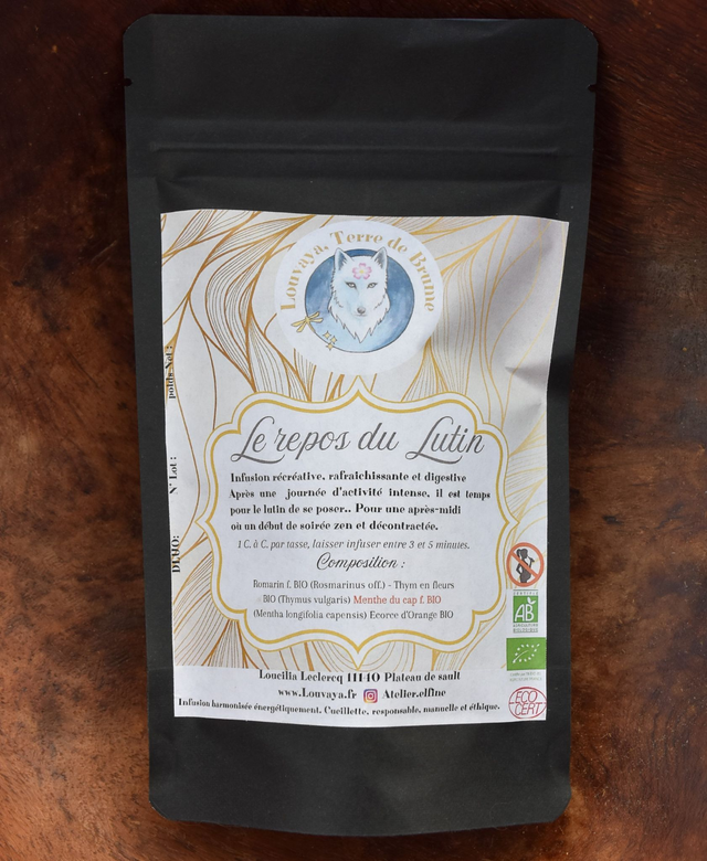 Le repos du lutin est une ode à la lenteur. Infusion récréative et digestive, pouvant être bu tous au long de la journée jusqu'à 17h pour les personnes sensibles à la menthe. Déconseillée aux femmes enceintes, par précaution, du à la menthe.