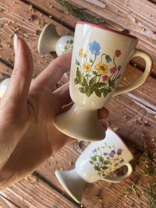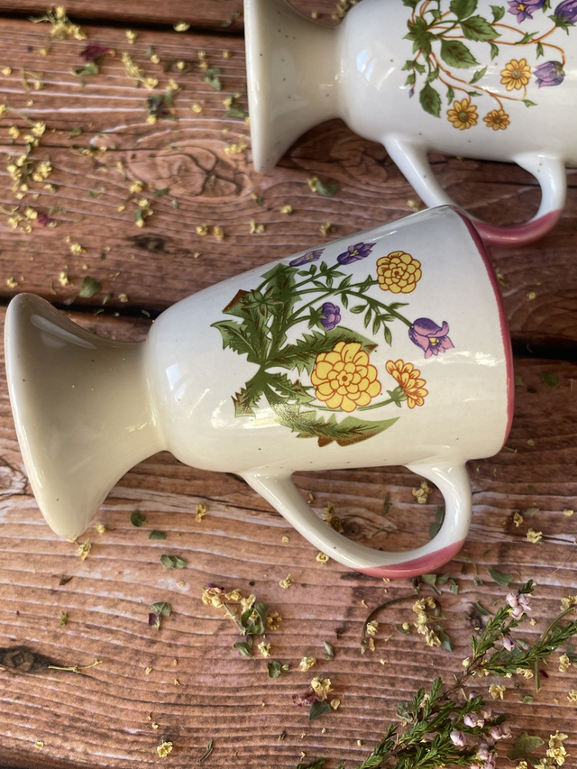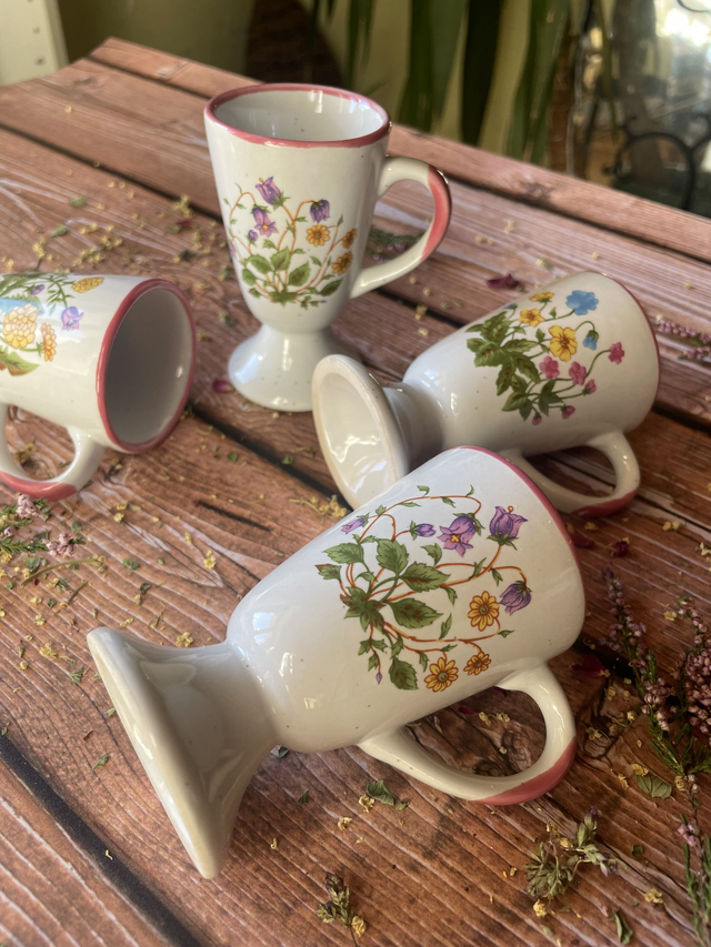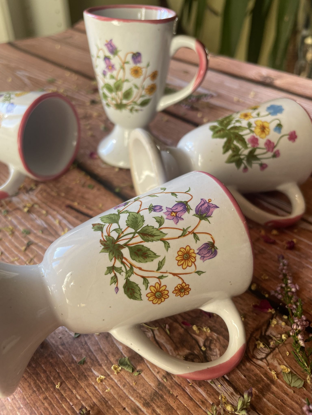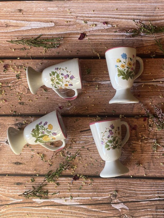Quatre petites tasses fleuries de lutin.e en grès avec l'infusion ventre serein.